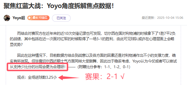 【上期回顾】:昨天私推暂停,不过近5胜4表现不俗!而两场超级重点英超方案1胜1走,近17胜12状态尚可!——今天核心赛事已确认,信心依旧,各位可点击一下【赞赏】按钮给予鼓励,轻松在“站内信”获取当天新鲜信心专场哦!多一份参考离喜悦再近一步,Yoyo将继续率粉粉们继续前行~