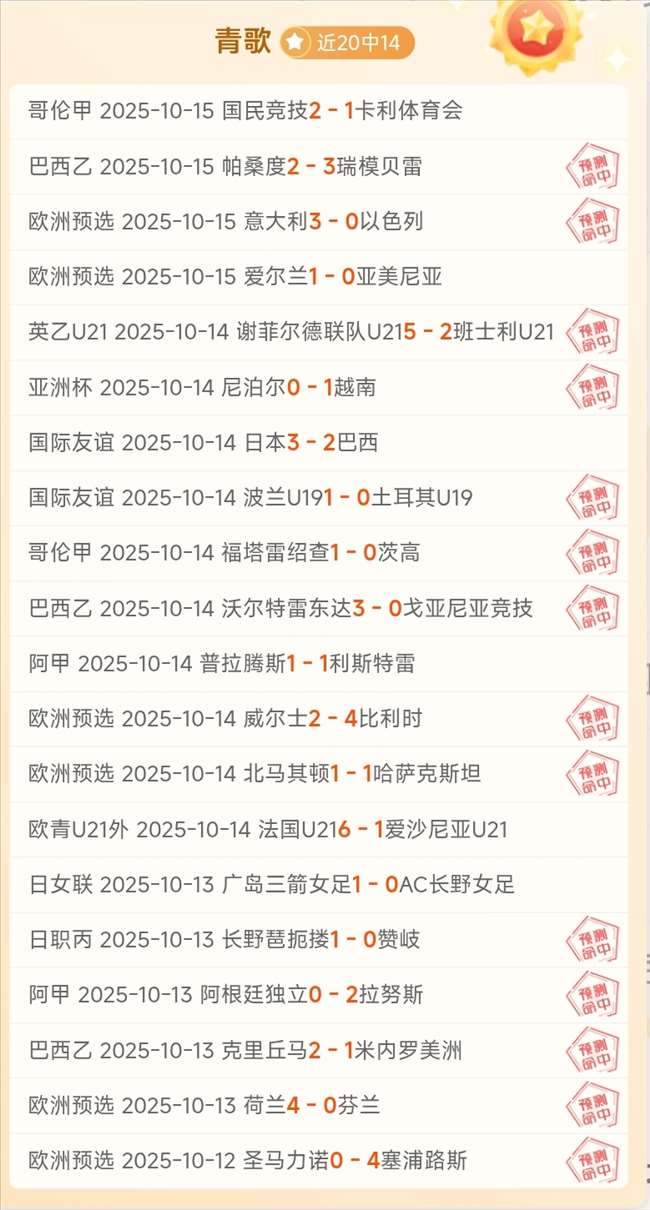 青歌简报:昨日8中5再次平安落地,连盈六天!超长线43中30的稳定发挥离不开老哥们的大力支持,深耕国内外次级联赛以及部分主流联赛,数据模型体系成熟,适合长期关注入手。