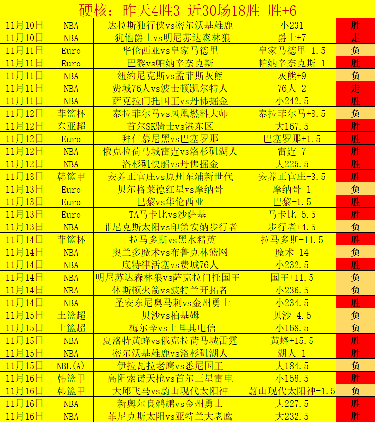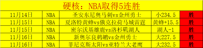 NBA昨天全胜,目前近5胜5,非常精彩的NBA表现。昨天4胜3,近30场胜18场,胜+6,胜+效果非常优质!