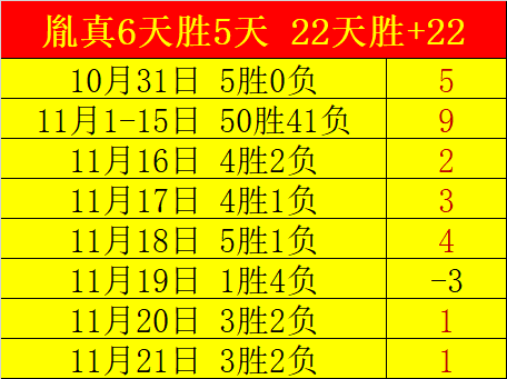 连取2天胜利,近6天胜5天胜+8,11月1-15日胜+9,10月胜+12,傲视群雄的胜+表现