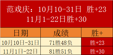 法甲7连胜,精彩的五大联赛开启。11月1-22日合计胜+30,10月10-31日合计胜+23,这样的胜+表现肯定是独占鳌头的