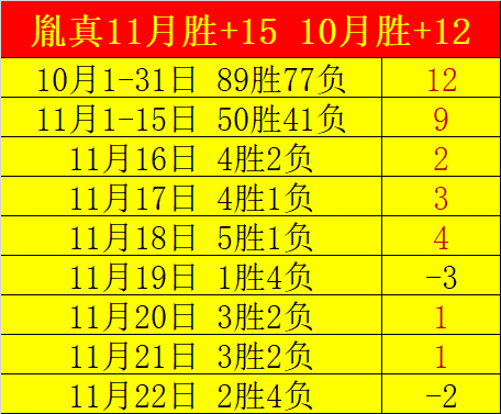11月1-22日已经取得胜+15辉煌发挥,同时10月胜+12,傲视群雄的胜+表现