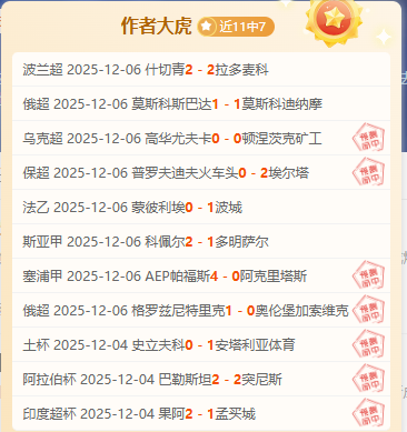 成绩回顾:近11中7!这几天状态还是相当不俗的,成绩都在稳定水平上,今天继续分享五场信心比赛给大伙,希望大家持续关注作者大虎。