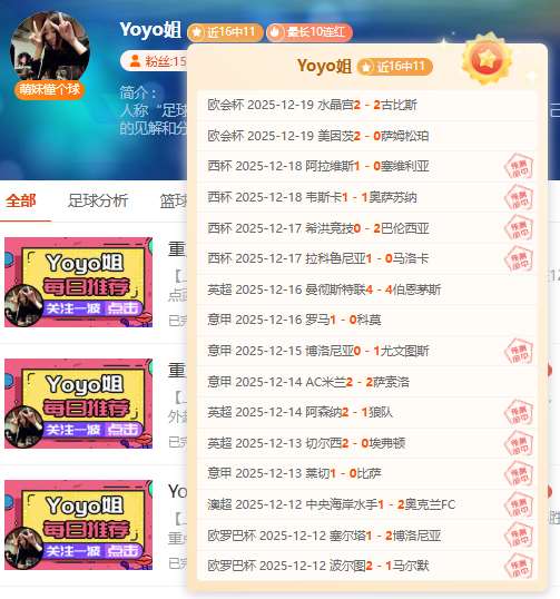 【上期回顾】:昨天私推暂停,而此前公推失利比较可惜,近18胜13表现尚可!而超级重点方案近8胜6,多次拿下彩蛋依然棒棒哒!——今天核心赛事已确认,信心依旧,各位可点击一下【赞赏】按钮给予鼓励,轻松在“站内信”获取当天新鲜信心专场哦!多一份参考离喜悦再近一步,Yoyo将继续率粉粉们继续前行~