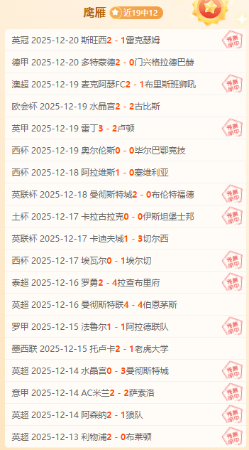 成绩回顾:近期成绩19胜13,整体状态稳定。感谢一直以来的支持与陪伴,今天看好不错的赛事,强项赛事很有信心,鹰雁也曾创下19连胜的超高记录。愿大家在观赛的同时,也能收获满满的喜悦与惊喜,觉得还行的不妨继续关注,一起开启精彩的足球之旅。