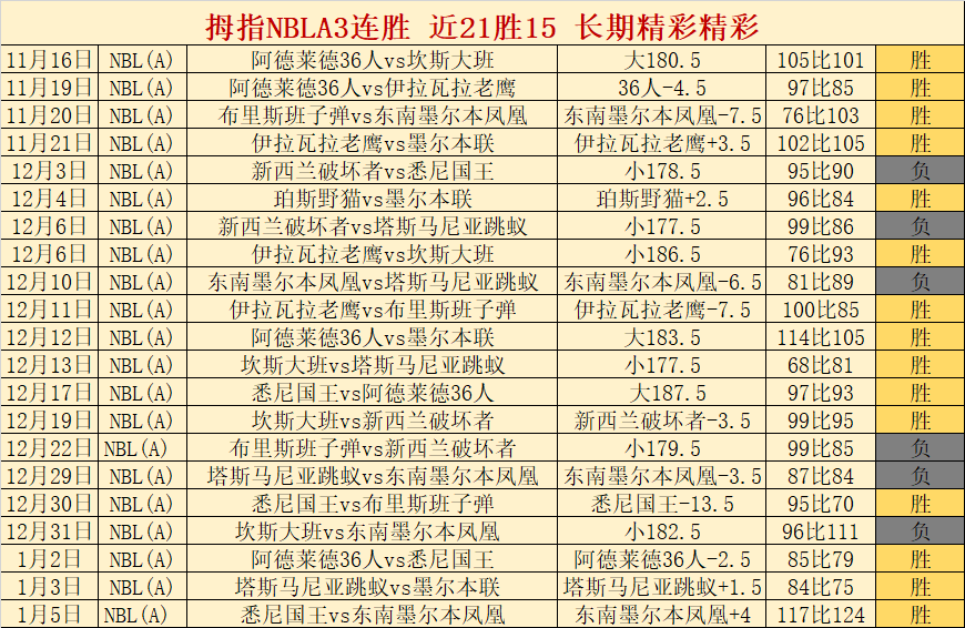NBLA3连胜,近21胜15,长期保持精彩的赛事。昨天胜利,连胜2天,近32天胜19天合计胜+16,非常惊人的胜+表现