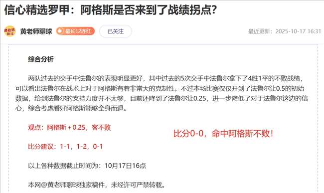 黄老师致力于研究各大赛事数据,拥有自己独创的数据模型,挑选的每场比赛都精心研究,我们以长线为主,长期效益非常不错,适合持续关注,保持一个好心态,我们一起共同进步!以下解锁内容包含:综合分析+观点方向+比分预测