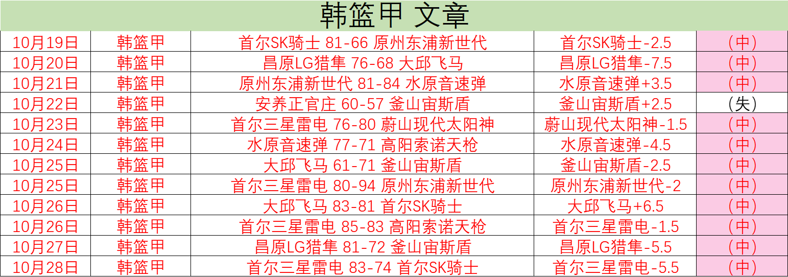 大邱飞马上赛季是28胜26负的成绩,激光管78,防守端74,季后赛是2-3不敌水原音速弹,大邱飞马遗憾出局了。近期赛事,大邱飞马95-82 [46-44]蔚山现代太阳神,昌原LG猎隼69-62 [35-34]大邱飞马,水原音速弹93-93 [47-52]大邱飞马,水原音速弹78-76 [41-39]大邱飞马,大邱飞马79-75 [36-33]水原音速弹,大邱飞马57-63 [32-29]水原音速弹,水原音速弹75-71 [44-34]大邱飞马,水原音速弹64-67 [32-37]大邱飞马,一起看看一起分析。新赛季,常规赛,大邱飞马1胜8负,原州东浦新世代5胜4负,