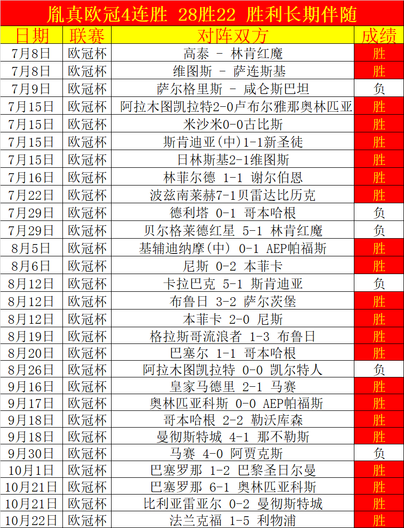 欧冠4连胜,近28胜22,胜利长期伴随这个赛事。胜利连续4天,近26场胜19场高超胜+12,胜+增长速度很精彩!