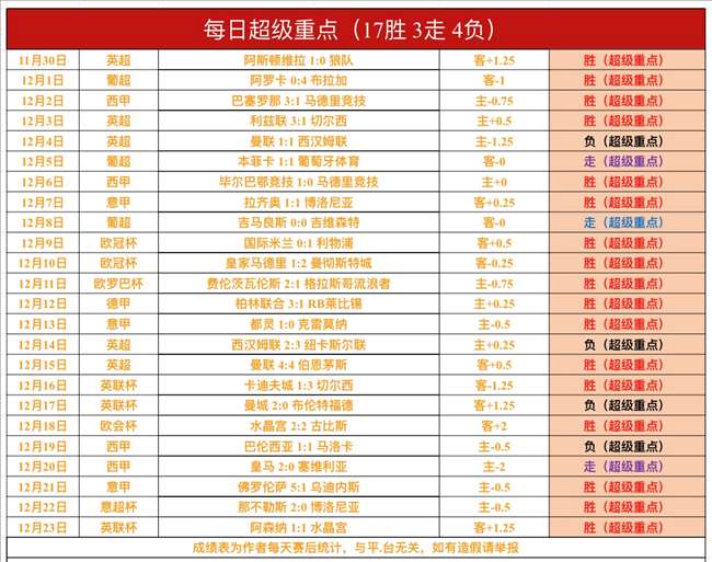 战绩回顾:昨日【每日超级重点】英联杯水晶宫方向完美全胜,【每日超级重点】近21胜17,成绩非常出色!解锁文章1战拿到胜利,近17胜12,成绩不俗!赞赏数据没有发送,赞赏数据依然保持连胜!总进球数没有发送,总进球数依然近4胜3!鸡锅不追求场次多,追求少而精准,绝不滥竽充数,必须把老铁们的每一份信任都转化为胜利!