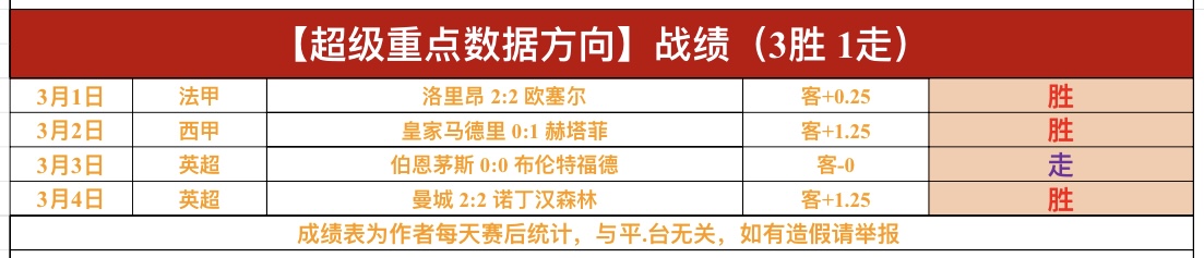 战绩回顾:昨日【超级重点数据方向】英超诺丁汉森林完美爆冷门全胜,超级重点拿到3连胜!私推{数据包周}1场完胜,近20胜15,非常强势!《精选数据方向》英超西汉姆联胜利,法国杯马赛没有打出!【超级重点总进球数】没有发送!私推总进球数依然近4胜3!鸡锅不追求场次多,追求少而精准,绝不滥竽充数,必须把老铁们的每一份信任都转化为胜利!