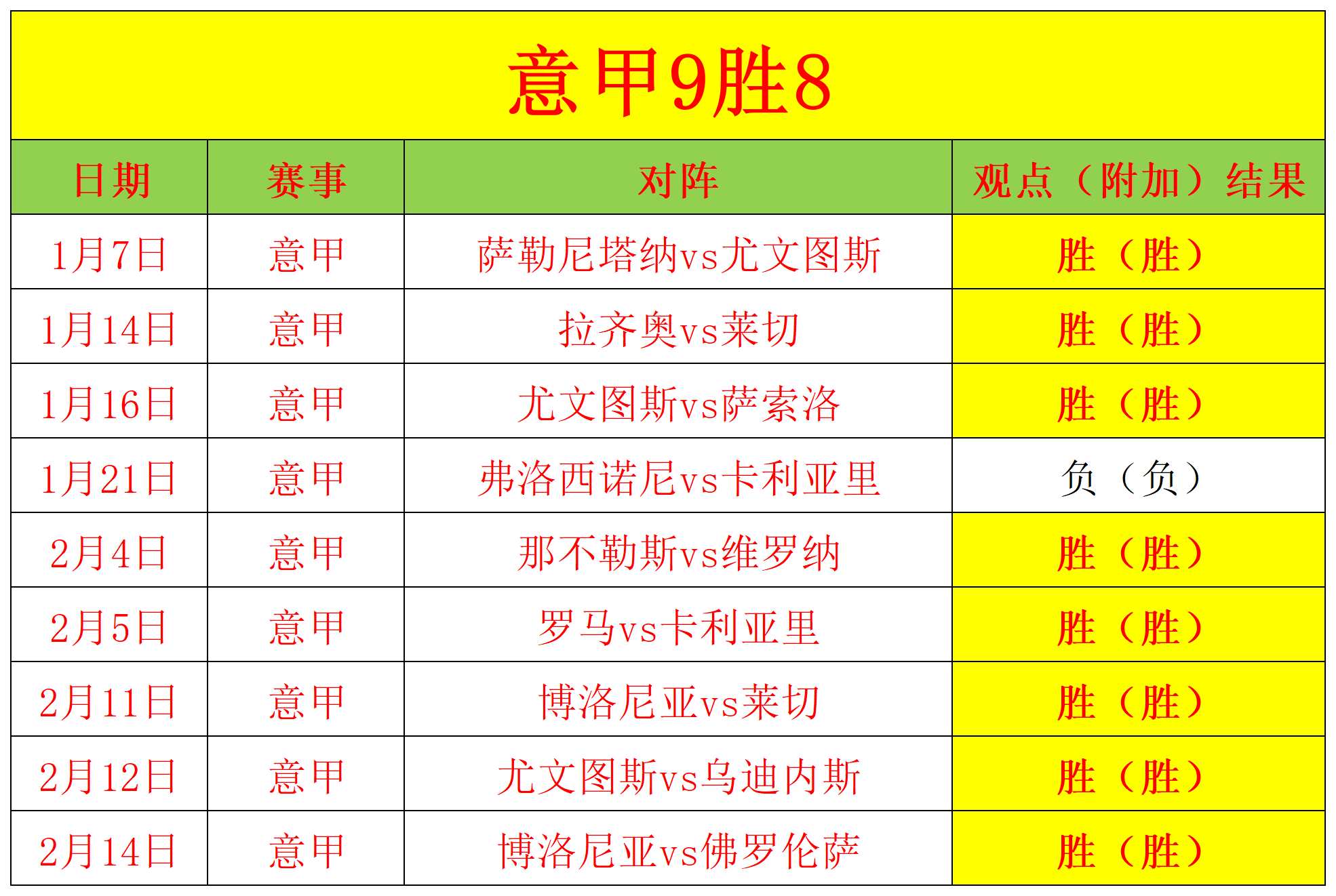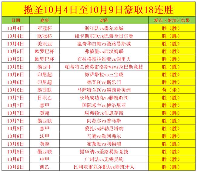 揽圣2023年10月4日至10月9日豪取18连胜。上期意甲再次拿下,近期意甲取得9胜8的佳绩,目前5连胜,今天我们再接再厉。足球比赛是追求长期的稳定,长期的关注才能得益,一时的下滑并不意味着失败,大家不要因为一时的下滑而放弃关注,笔者会努力挖掘更精准的赛事分享给大家,感谢大家的支持。