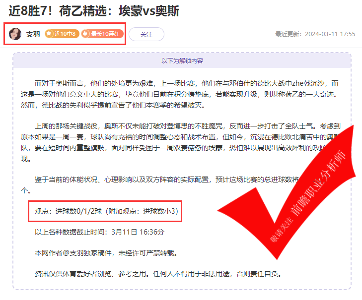 昨天的荷乙精选赛事,埃蒙0-1奥斯,进球数小于3场,胜利!成绩喜人,公推赛事利雅得胜利也如愿在常规时间胜利!今晚支羽继续努力,争取更好成绩。