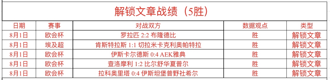 战绩回顾:鸡锅每日精选7场比赛,追求的是长期稳定的胜利!昨日整体成绩不错,总计7场比赛,拿到5胜2负,总体收获不错,开始慢慢找回大胜利节奏!解锁文章5场,完美大全胜拿下,埃及超切拉米、欧会杯罗拉匹、AEK雅典、比尔舒、伊斯坦堡,完美全胜拿下,解锁文章强势大反弹!私推赞赏1场,欧会杯AEP帕福斯巨大优势可惜差一个球,小负一半,私推赞赏长期拿到24胜5走6负,成绩非常出色,胜.率高达8成!私推总进球数1场没有打出,被数据诱导了,判断错误,私推总进球数近37失12,成绩稳定!周五必须火力全开,大全胜搞起来!公告:赞赏文章项目目前改为由站内信推送观点,8月5日开始所有临场观点都将由站内信推送,老铁们注意登陆个人账号及时查收站内信推送,后续将没有短信推送了,谢谢支持!